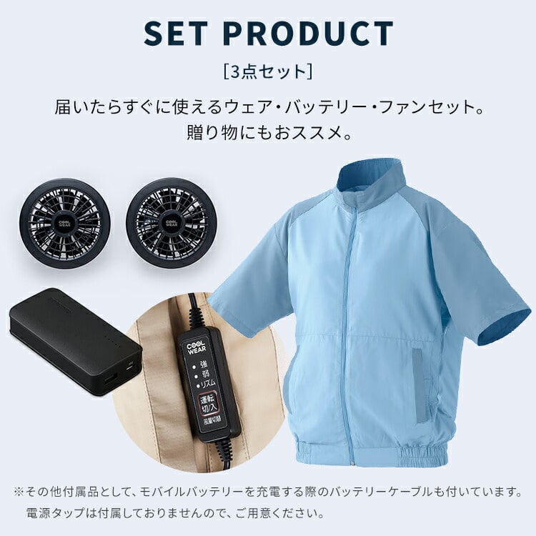 ファン、コントローラーケーブル、モバイルバッテリー、ウェアのセット。