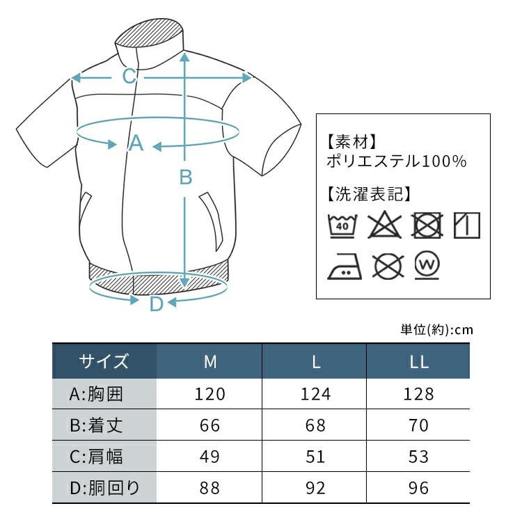 M:胸囲約120、着丈約66、肩幅約49、裄丈約48、裾廻約88