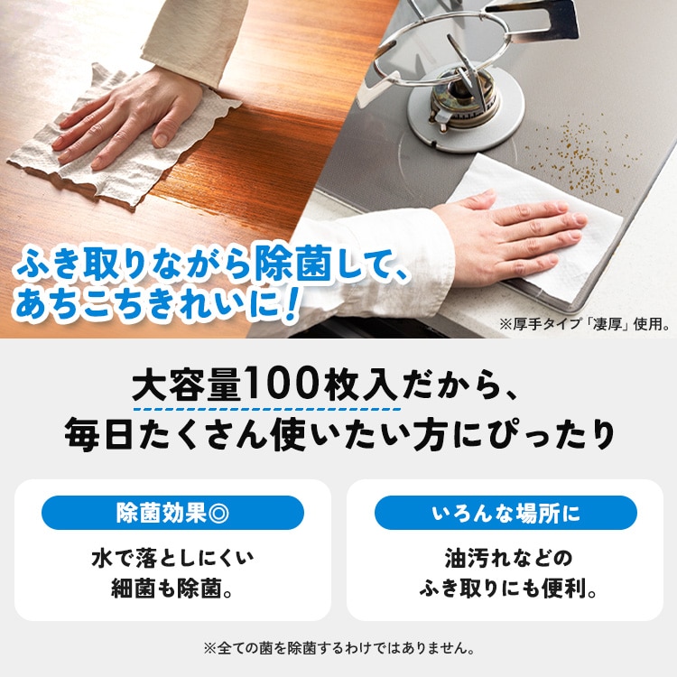 (※「除菌」とは「拭き取ることにより、対象とする硬質表面[手指などの身体部分を含まない]から増殖可能な細菌数[生菌数]を有効減少させること」を指します。)
