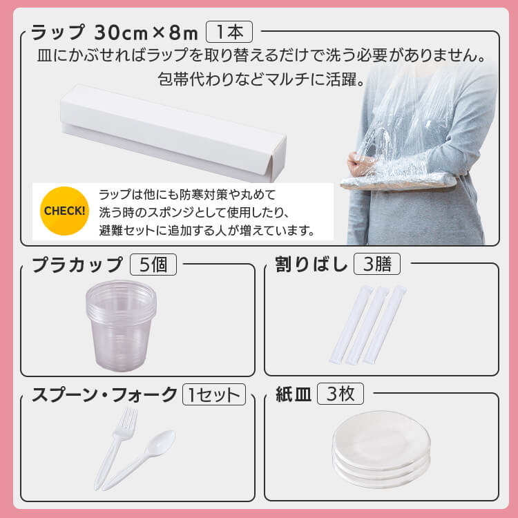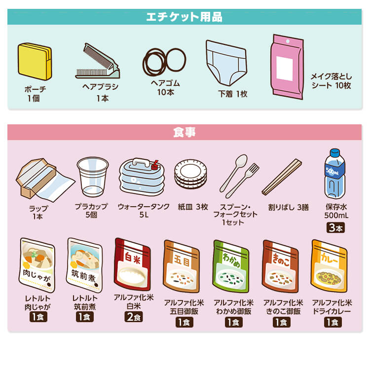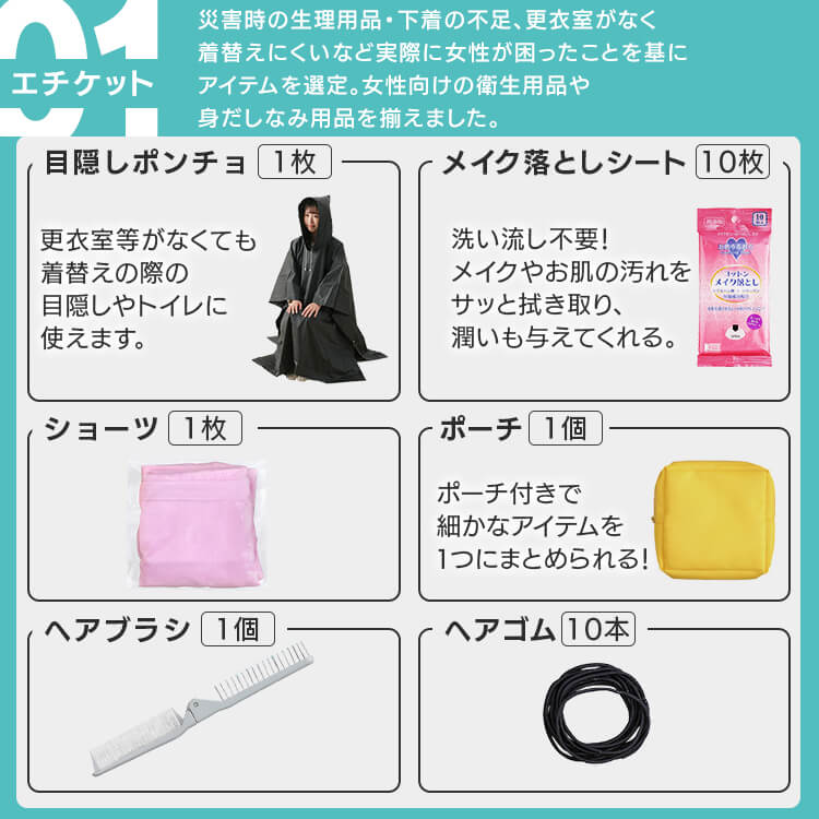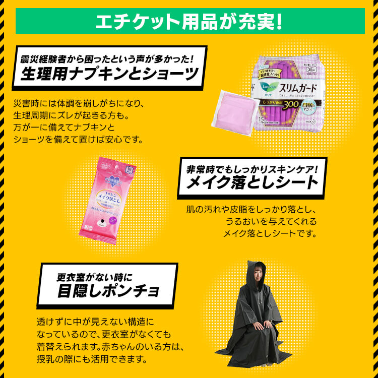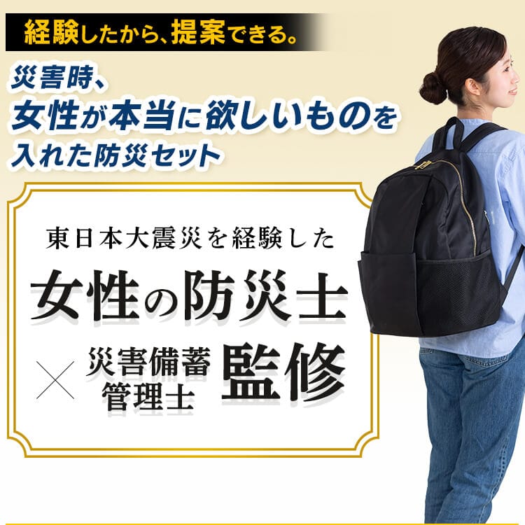 災害時に役立つ用品をセットにした、女性向けの防災リュックです。