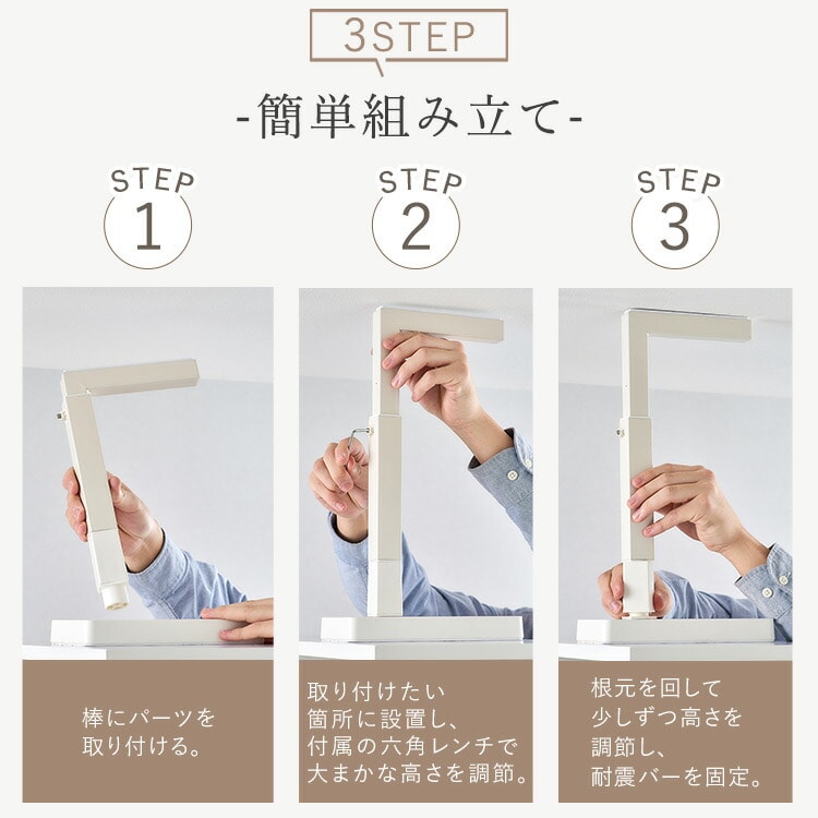 3.根元を回して少しずつ高さを調節し、耐震バーを固定。
