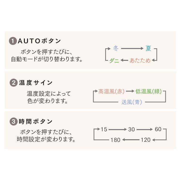 「ダニモード」「あたためモード」など便利な自動モード付き。