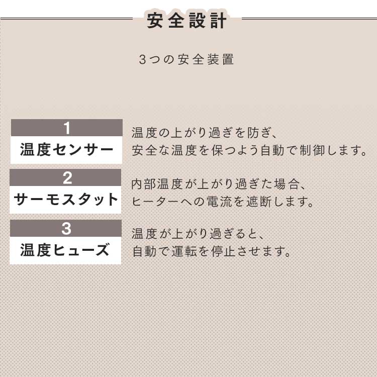 温度の上がり過ぎを防ぐ3種類の安全装置(温度センサー/サーモスタット/温度ヒューズ)を搭載。