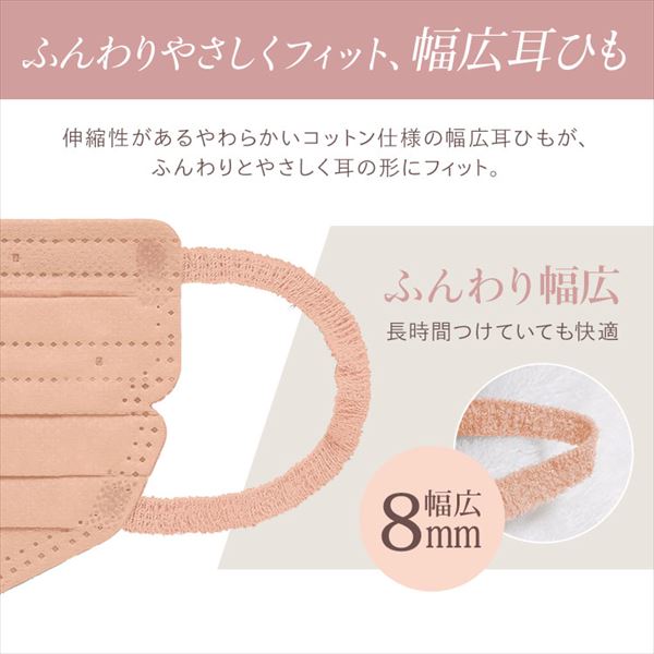 伸縮性があるやわらかいコットン仕様の幅広耳ひもが、ふんわりとやさしく耳の形にフィット。