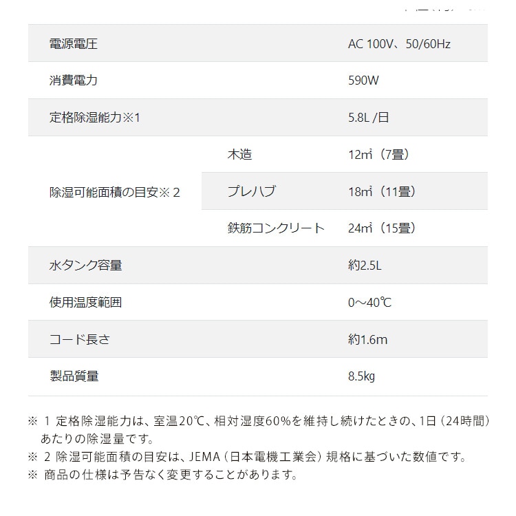 ※2:除湿可能面積の目安は、JEMA(日本電気工業会)規格に基づいた数値です。