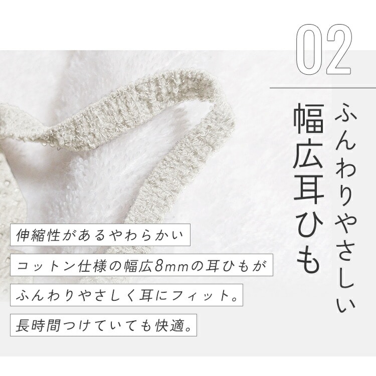 伸縮性のあるコットンの帯状の耳ひもが、耳に優しくフィット。