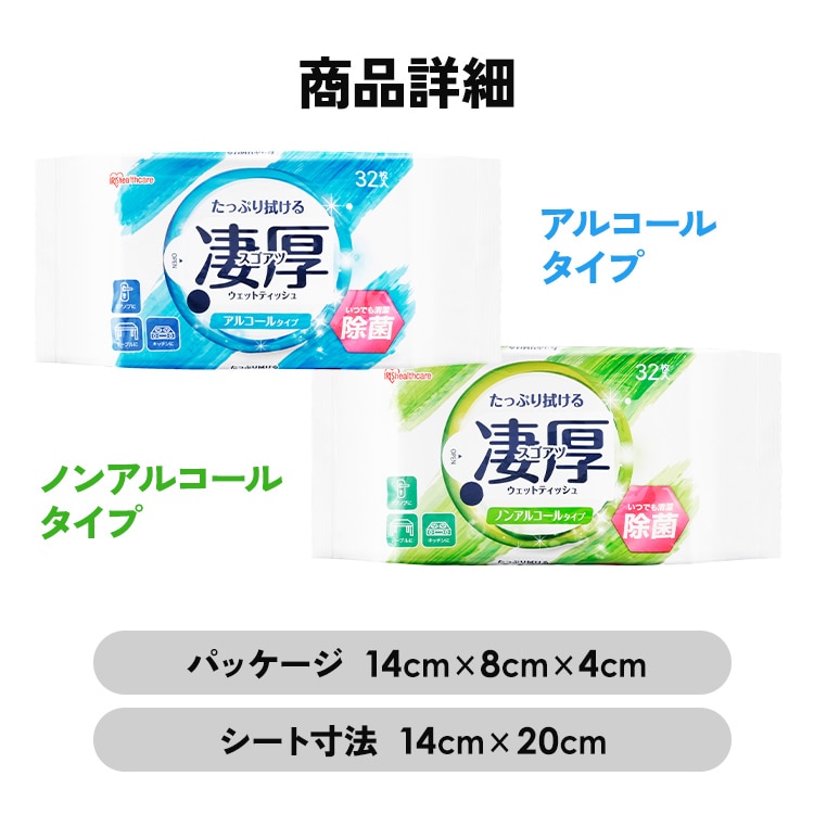 ![[公式]ウェットティッシュ アルコール 厚め エタノール 除菌シート 厚手 乾きにくい 除菌 持ち運び 凄厚ウェットティッシュ 32枚入り アイリスオーヤマ WTP-32A1P アルコールタイプ](/img/0119/goods/D1/0119-298671.jpg)