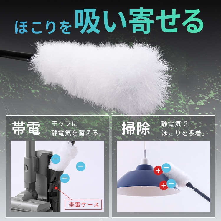 帯電ケースで静電気を蓄え、静電気でほこりを吸着する静電モップ。