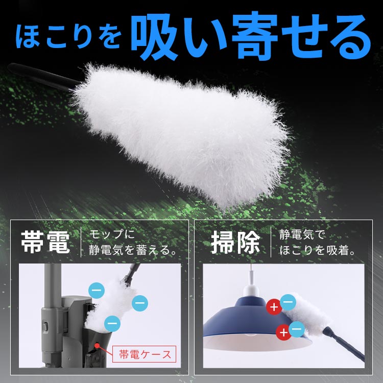 帯電ケースで静電気を蓄え、静電気でほこりを吸着する静電モップ。