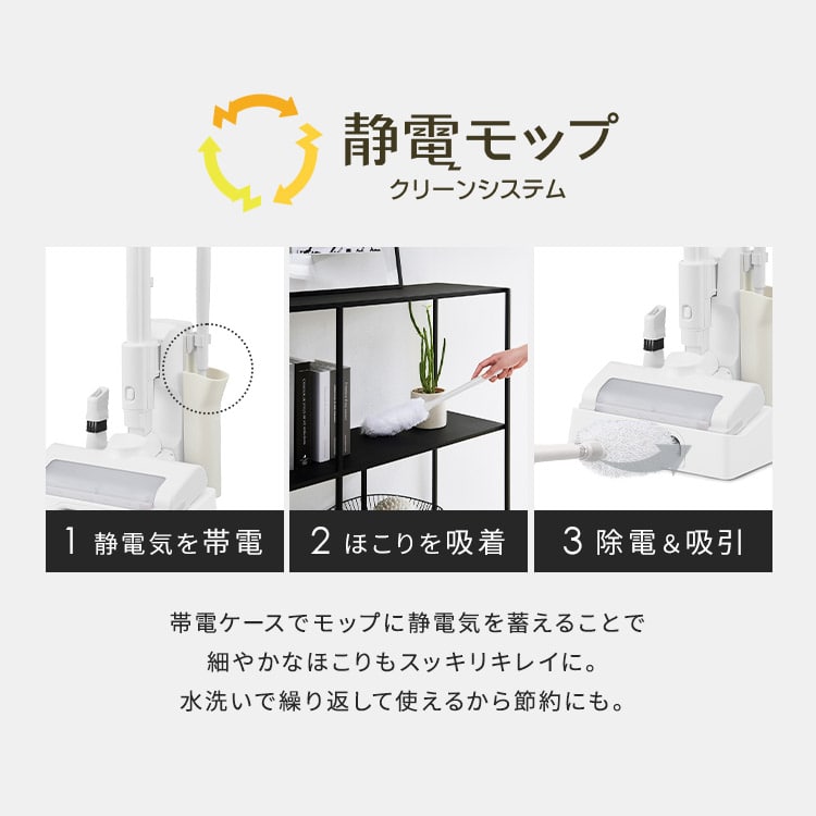アイリスオーヤマ独自技術「静電モップクリーンシステム」搭載。