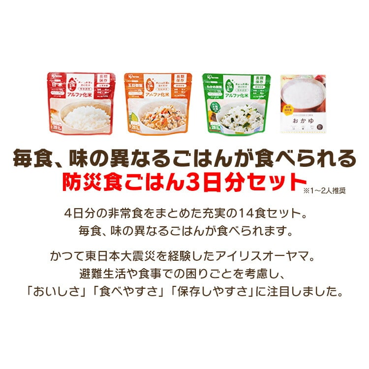 ![[公式]非常食セット 防災食 アルファ米 3種8食 おかゆ 6食 アイリスオーヤマ](/img/0119/goods/D3/0119-312075.jpg)