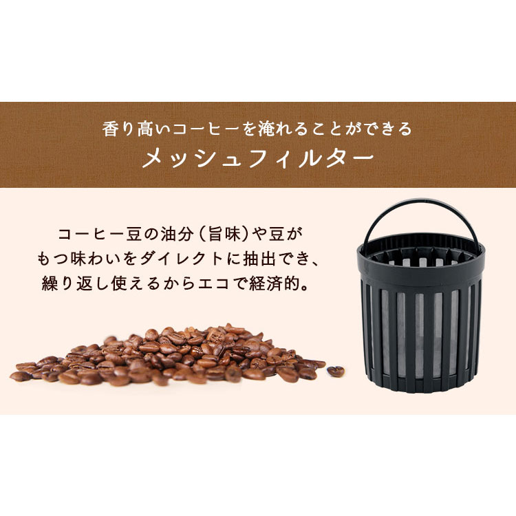 メッシュフィルター採用で紙フィルターを使わずそのままコーヒー豆やコーヒーの粉を入れることができます。