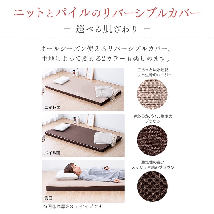 カバーは“パイル生地(ブラウン):やわらかな肌触り/吸水速乾生地(ベージュ):さらっと快適”のリバーシブル仕様。