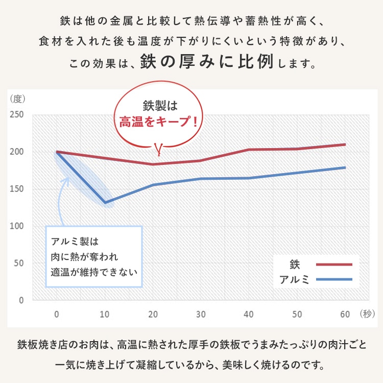 鉄は熱伝導と蓄熱性が高く、食材を入れた後も温度が下がらず高温をキープ。