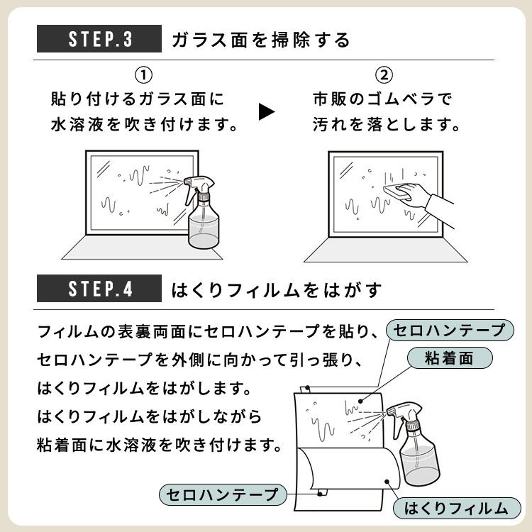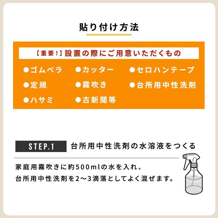 ●設置の際に用意するもの:ゴムベラ・定規・ハサミ・カッター・霧吹き・台所用中性洗剤・セロハンテープ・古新聞など