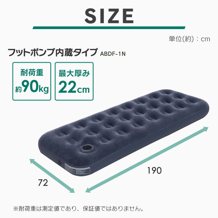 ・フットタイプ:専用ポンプ不要、マットに内蔵されたポンプを足踏みするだけで簡単に空気が送れます。