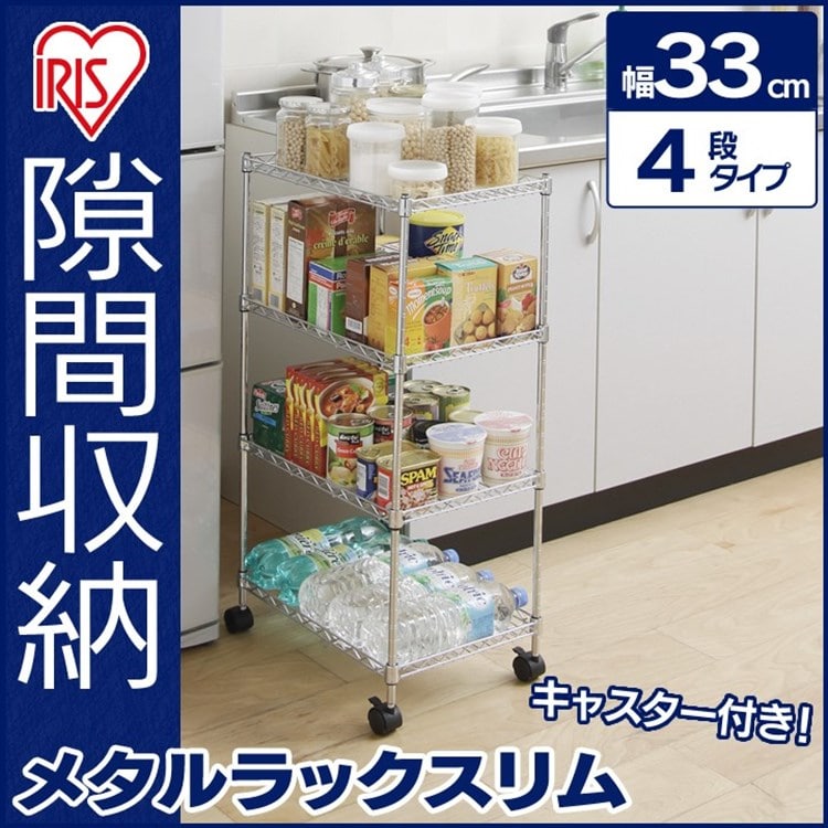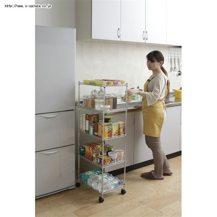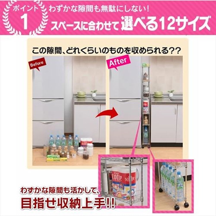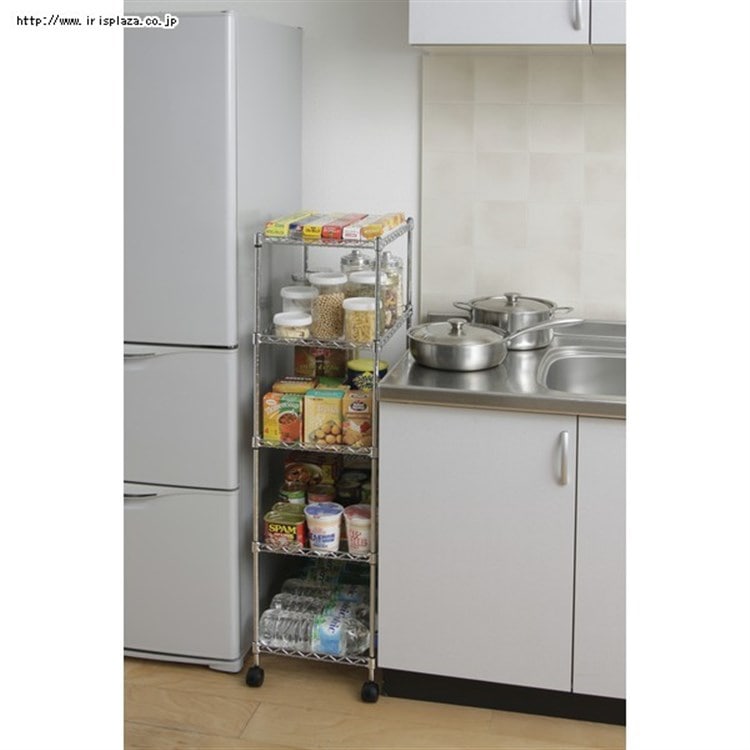 冷蔵庫とシンクの間、コンロと壁の間などにできる隙間を上手に活用することのできるメタルスリムです。