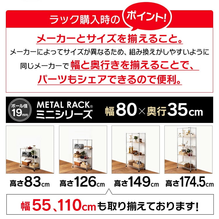 奥行き35cmで、衣類・家電等の収納にぴったりなサイズのメタルミニです。