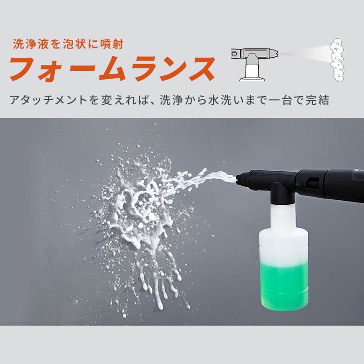 フォームランス:洗剤を使用することでより洗浄効果UP。アタッチメントを変えることで洗浄から水洗いまで一気に可能。タンクに直接洗剤を入れての洗浄も可能!