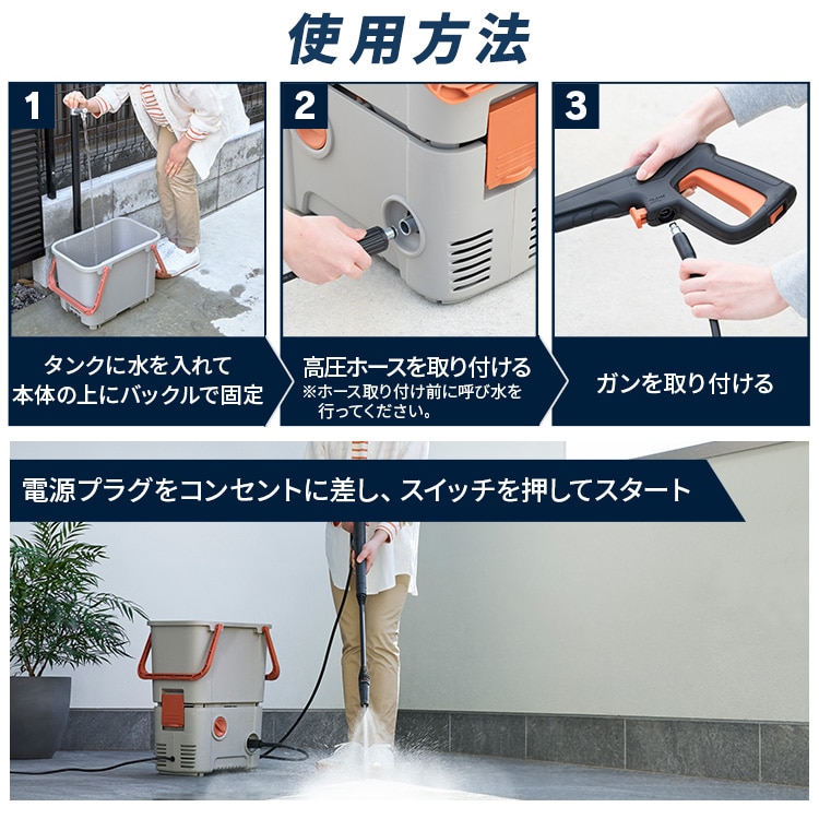 近くに水道(蛇口)がなくても使える、高圧洗浄機です。