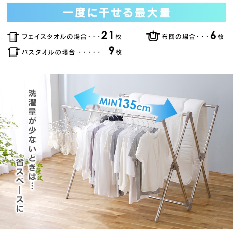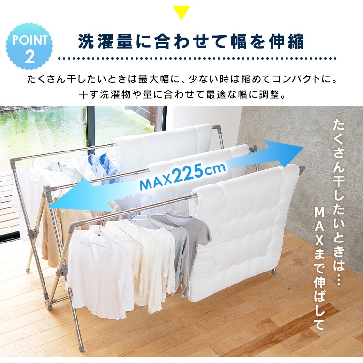 たくさん干したいときは最大幅に、少ない時は縮めてコンパクトに。