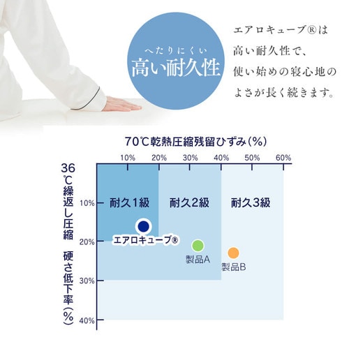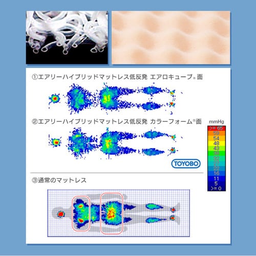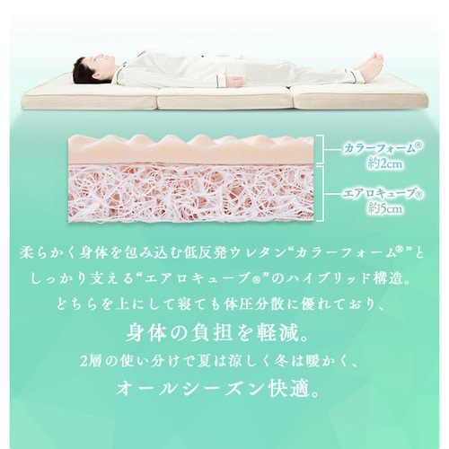 柔らかく身体を包み込む低反発ウレタンカラーフォームとしっかり支えるエアロキューブの2層からなるハイブリット構造。