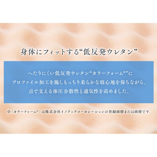 へたりにくい低反発ウレタンカラーフォームにプロファイル加工を施しもっちり柔らかな寝心地を保ちながら、点で支える体圧分散性と通気性を高めました。