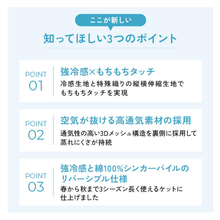 従来の商品に比べ、ミント加工を施しているのでひんやり感がグレードアップ、肌に触れると爽やかで冷たい素材のケットです。