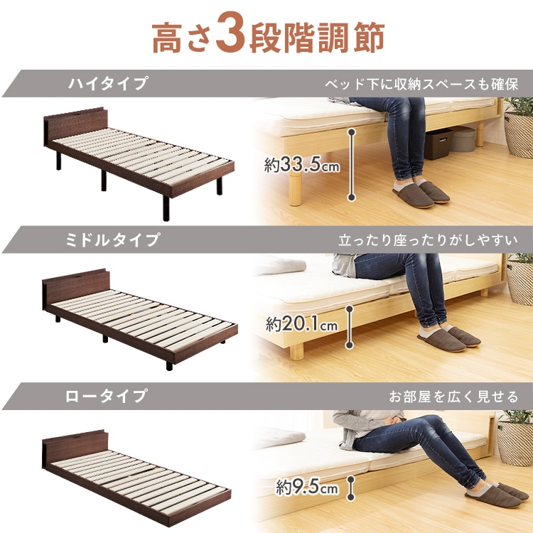 高さ3段階、サイド収納も備えた棚、2口コンセント付きのスノコベッドです。