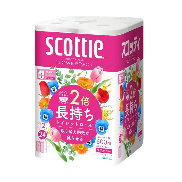 12ロールで24ロール分の長さ(※当社製品比)。取り替えの手間が半分でたっぷり使える、ダブルタイプ50mのトイレットペーパー。