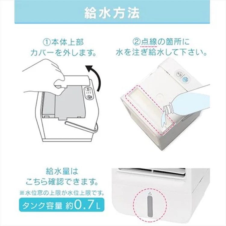 水タンクに水を入れ、水を含ませた給水フィルターを通して風を送ります。