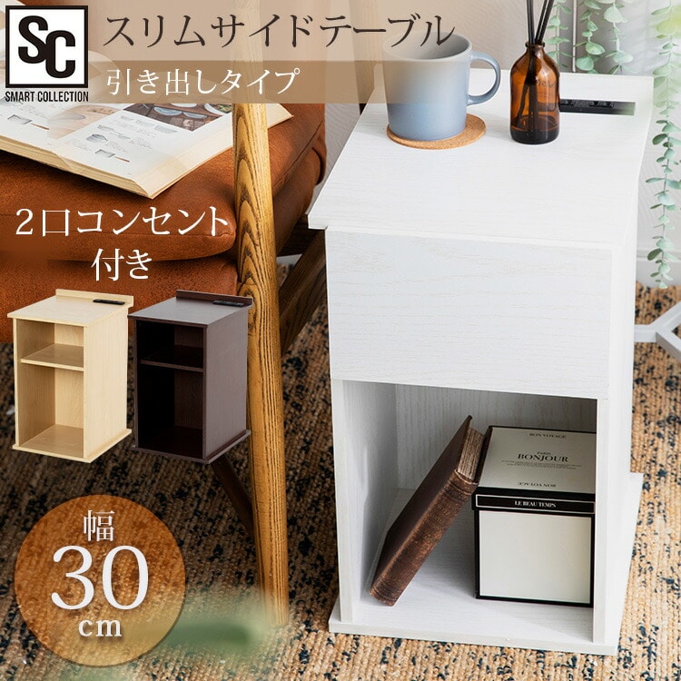 収納やコンセントが付いた機能的なデザインのサイドテーブル。