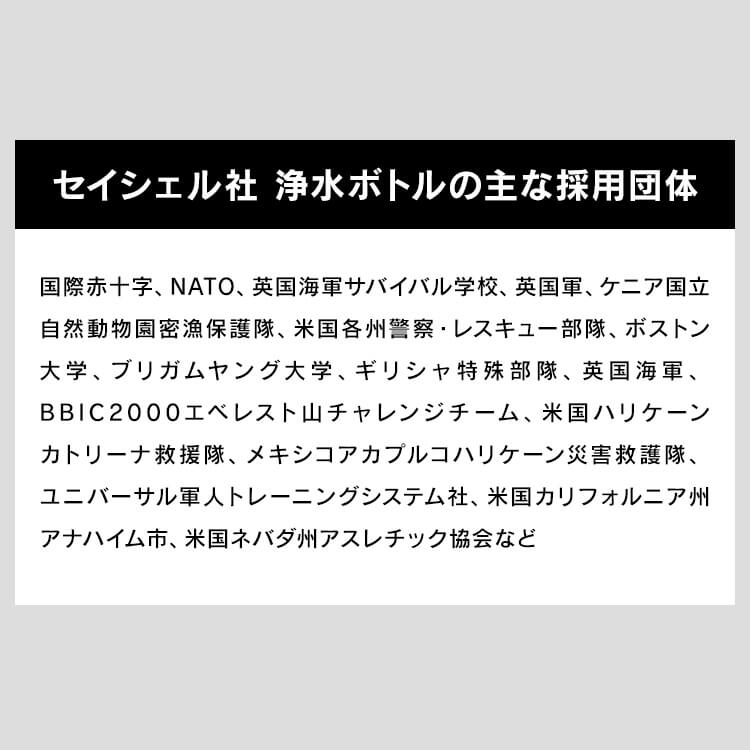 携帯性に優れたボトル1本でブッシュクラフトやキャンプ、フィッシング、登山、サバイバルゲームなどのフィールドの水源、河川や湖、自然の湧き水に含まれる細菌や病原体などの汚染物質を除去することができ、飲料水を効果的に得ることができます。