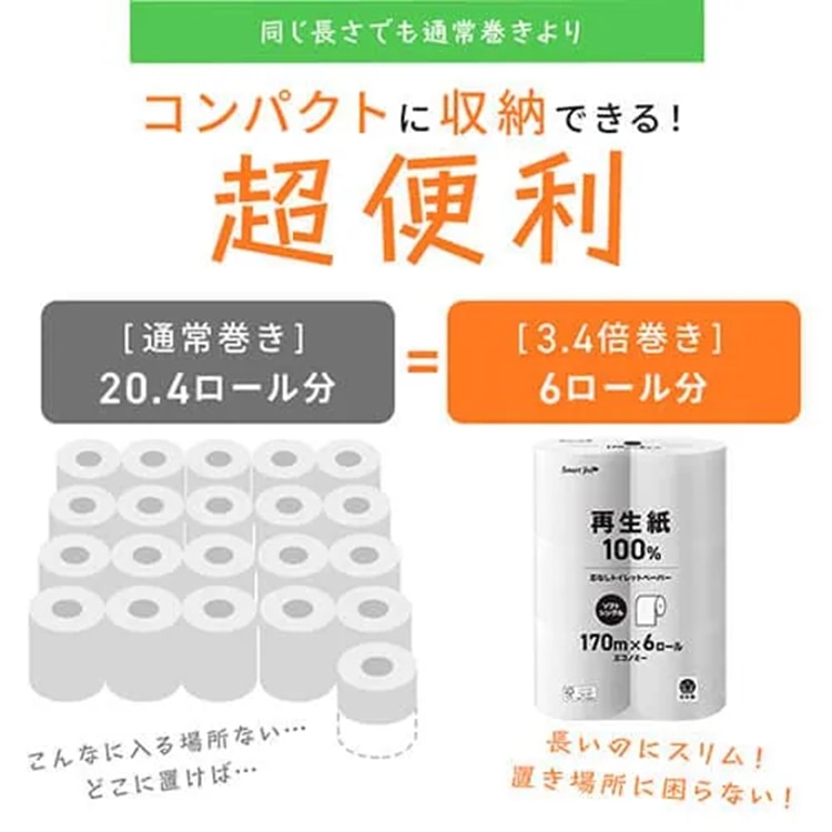 ![[マイル5倍!12/7迄]トイレットペーパー 日用消耗品 スマートエール 芯なし 170m トイレットロール トイレットペーパー 芯なし シングル 170m 6ロール コアレス 再生紙 3.4倍 備蓄 まとめ買い](https://ec.jal.co.jp/img/0119/goods/sku/7270427_06.jpg)