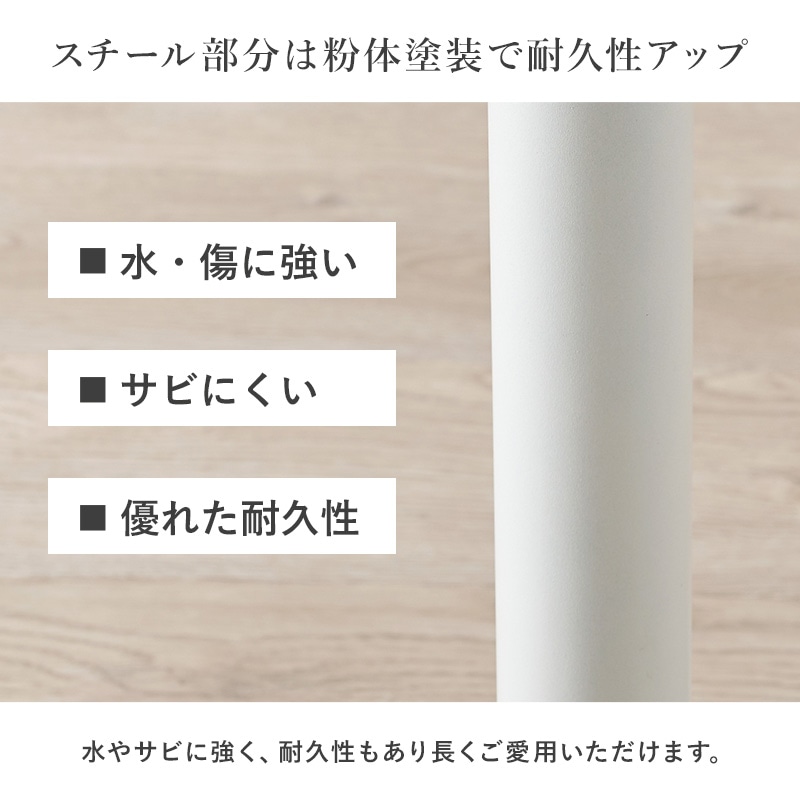 天板:合成樹脂化粧繊維板(メラミン樹脂)、脚部:スチール