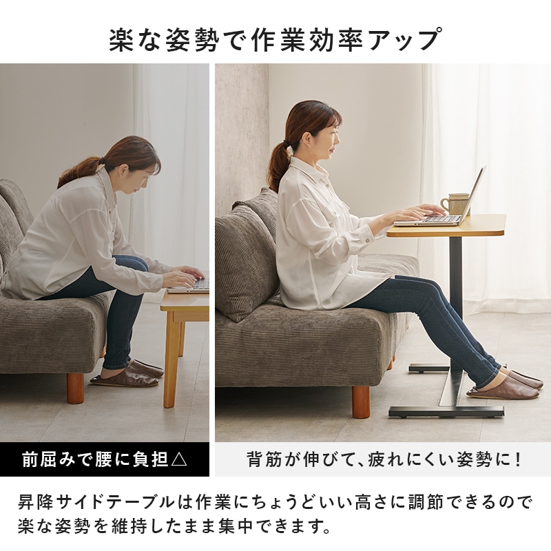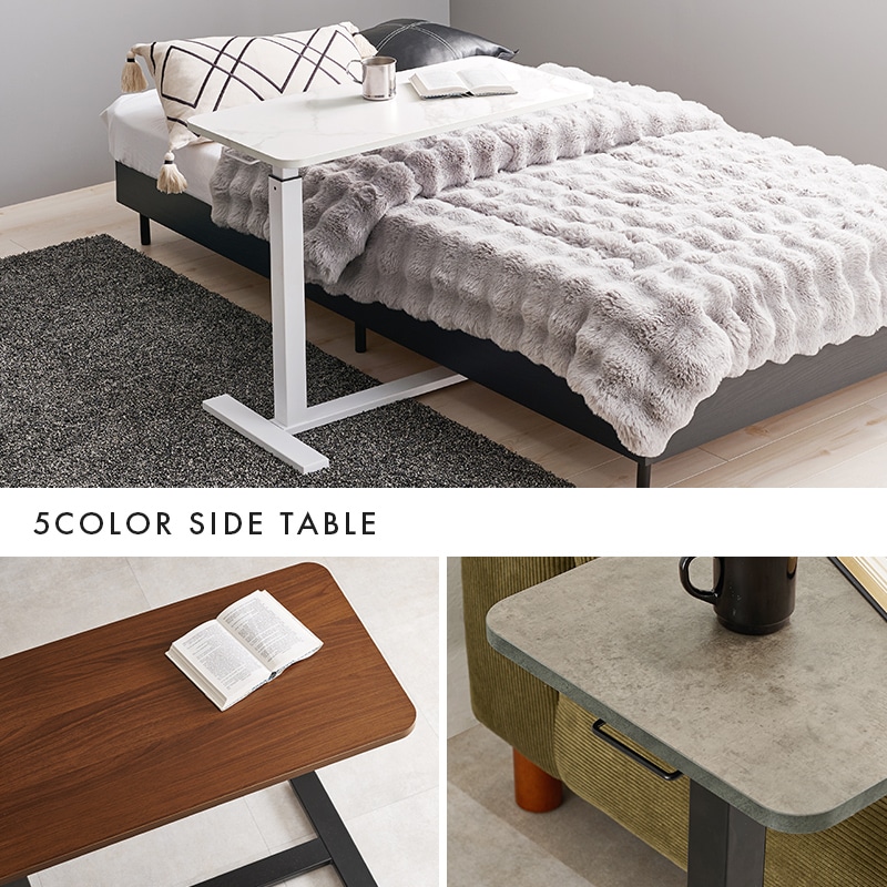 シーンに合わせて高さが変えられる無段階の昇降機能付きサイドテーブル。