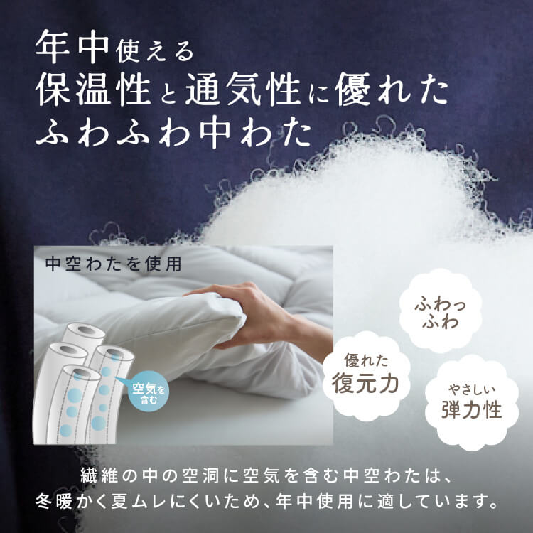 側地に部屋干し臭防止加工と中綿には抗菌防臭防ダニ加工を施しています。