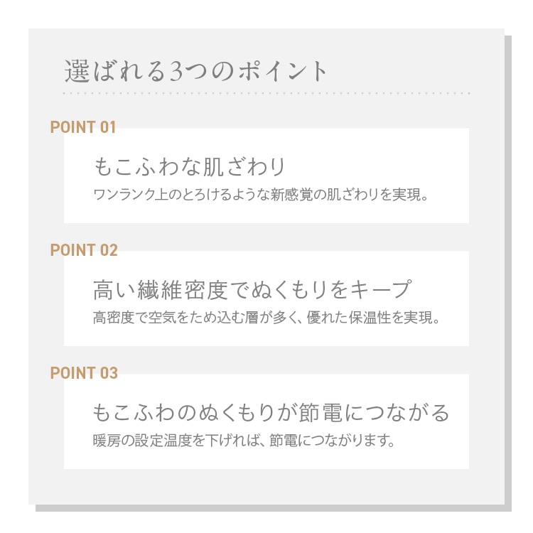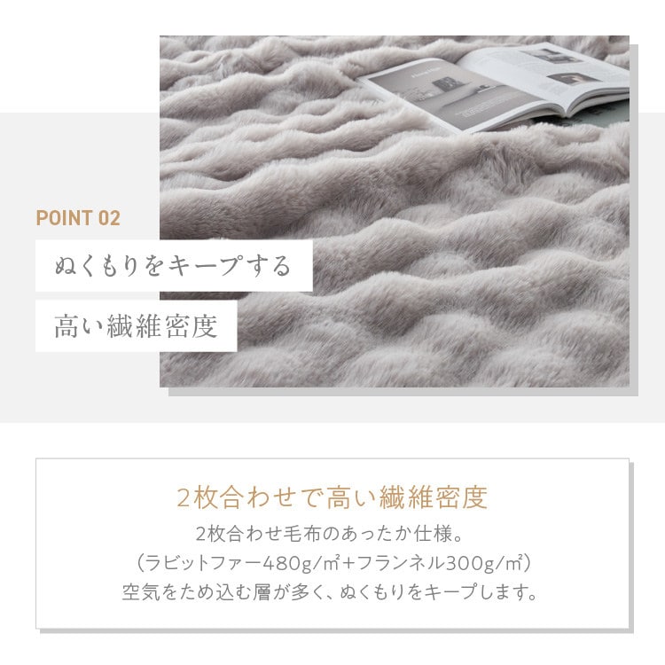 もこもこした立体カットでとろけるような肌ざわりが特長のラビットファー面と、短い毛足で上品な光沢感となめらさが特長のフランネル面の2つの素材を楽しめます。