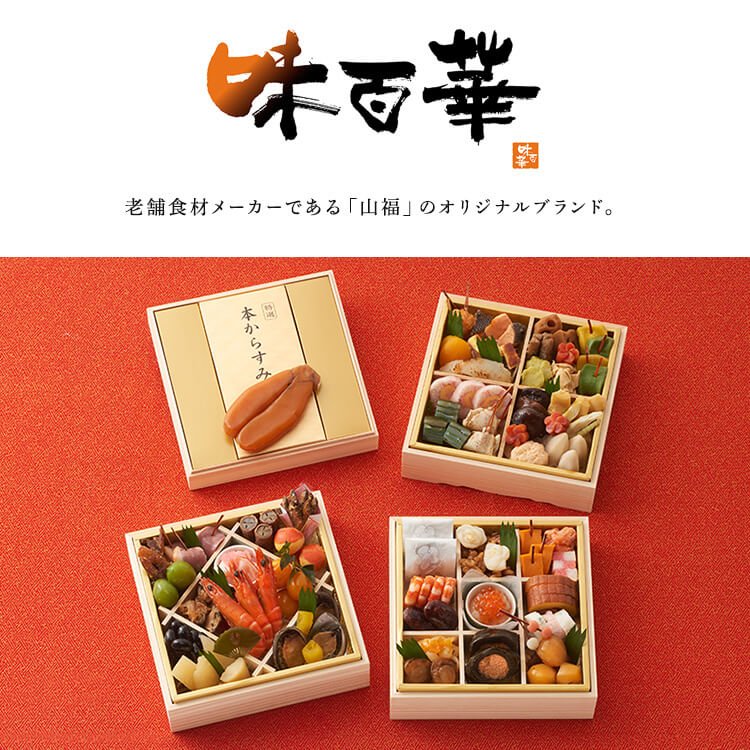 老舗食材メーカー「山福」のおせち料理。「本からすみ」や「とこぶし旨煮」、「南高梅白板昆布巻」など厳選したごちそうを惜しみなく盛り込んだ豪勢なおせちです。