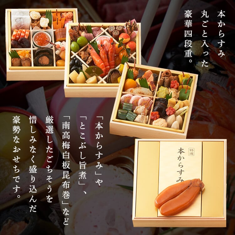 本からすみ丸ごと入った豪華4段重。新春の席を華やぎます。