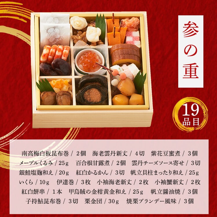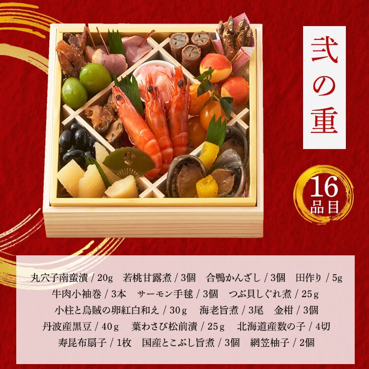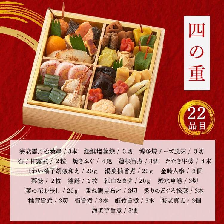 からすみ(国内製造)、椎茸旨煮 、蟹水車巻(風味かまぼこ、大根、紅ズワイガニ、その他)、牛肉小袖巻、子持鮎昆布巻、伊達巻、南高梅白板昆布巻、海老雲丹真丈、海老真丈、帆立醤油焼、海老旨煮、丹波産黒豆、博多焼チーズ風味、海老芋旨煮、サーモン手毬、北海道産味付数の子、国産とこぶし旨煮、合鴨かんざし、小柱と烏賊の卵紅白和え、特選完熟金柑 、栗金団、銀鮭塩麹焼、焼きふぐ、炙りのどぐろ松葉、筍旨煮、若桃甘露煮、重ね鯛昆布〆、焼栗ブランデー風味、帆立貝柱まったり和え、つぶ貝しぐれ煮、葉わさび松前漬、メープルくるみ、甲烏賊の金柑黄金和え、雲丹チーズソース寄せ、海老雲丹松葉串、蓮根旨煮、丸穴子南蛮漬、銀鮭塩麹和え、くわい柚子胡椒和え、湯葉の柚香煮、紅白なます、菜の花お浸し、栗麩、蓬麩、百合根甘露煮、海老真丈、蟹真丈、たたき牛蒡、紅白かるかん、杏子甘露煮、金時人参、紫花豆密煮、姫竹旨煮、金柑、網笠柚子、いくら、田作り、紅白餅串、寿昆布扇子/調味料(アミノ酸等、有機酸等)、加工デンプン、酒精、着色料(カラメル、カロチノイド、クチナシ、紅麹、赤3、赤102、赤104、青1、黄4,黄5)、ソルビット、糊料(加工デンプン、増粘多糖類、グァーガム、キサンタンガム、セルロース、ローカストビーンガム)、トレハロース、乳化剤、pH調整剤、酸味料、酢酸(Na)、香料、甘味料(ステビア、ソルビット、スクラロース、甘草)、グリシン、保存料(しらこたん白、ポリリジン、ソルビン酸K)、野菜色素(トマト色素、パプリカ色素)、ポリリン酸Na、酸化防止剤(亜硫酸Na、ビタミンE、ビタミンC)、ビタミンB1、酵素、ショ糖脂肪酸エステル、酒精、カラシ抽出物、漂白剤(亜硫酸塩、次亜塩素酸ナトリウム)、メタリン酸Na、発色剤(亜硝酸Na)、重曹、硫酸第一鉄、(一部にえび・かに・くるみ・小麦・卵・乳成分・いか・いくら・牛肉・ごま・さけ・さば・大豆・鶏肉・豚肉・もも・やまいも・りんご・ゼラチンを含む)