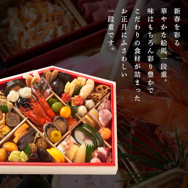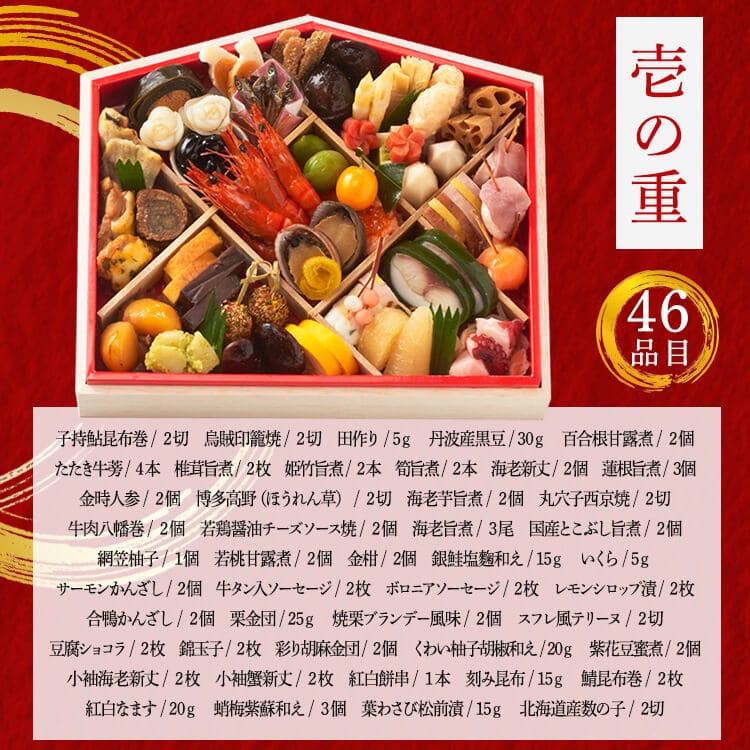鯖昆布巻(国内製造)、海老旨煮、子持鮎昆布巻、豆腐ショコラ、椎茸旨煮、スフレ風テリーヌ、海老新丈、丹波産黒豆、牛肉八幡巻、紫花豆蜜煮、金柑、海老芋旨煮、栗金団、錦玉子、若鶏醤油チーズソース焼、彩り胡麻金団、蛸梅紫蘇和え、国産とこぶし旨煮、蓮根旨煮、丸穴子西京焼、合鴨かんざし、くわい柚子胡椒和え、紅白なます、筍旨煮、若桃甘露煮、焼栗ブランデー風味、北海道産数の子、百合根甘露煮、たたき牛蒡、サーモンかんざし、海老新丈、蟹新丈、牛タン入ソーセージ、ボロニアソーセージ、金柑、銀鮭塩麹和え、刻み昆布、葉わさび松前漬、博多高野(ほうれん草)、烏賊印籠焼、姫竹旨煮、レモンシロップ漬、金時人参、田作り、網笠柚子、いくら、紅白餅串/調味料(アミノ酸等、有機酸等)、加工デンプン、ソルビット、糊料(増粘多糖類、加工デンプン、キサンタンガム、セルロース、ローカストビーンガム、セルロース)、酒精、pH調整剤、乳化剤、トレハロース、着色料(カラメル、カロチノイド、クチナシ、ウコン、クチナシ、モナスカス、赤102、赤104)、環状オリゴ糖、リン酸塩(Na、K)、甘味料(甘草、ステビア)、酸味料、酢酸Na、酸化防止剤(亜硫酸塩、エリソルビン酸Na、ビタミンC、ビタミンE、EDTA-Ca、Na)、香料、ポリリン酸Na、グリシン、膨張剤、保存料(しらこたん白)、豆腐凝固剤、フマル酸、カラシ抽出物、重曹、メタリン酸Na、漂白剤(亜硫酸塩、次亜硫酸ナトリウム)、ビタミンB1、発色剤(亜硝酸Na)、トウガラシ抽出物、くん液、酵素、ミョウバン、硫酸第一鉄、(一部にえび・かに・小麦・卵・乳成分・いか・いくら・牛肉・ごま・さけ・さば・大豆・鶏肉・豚肉・もも・やまいも・ゼラチンを含む)
