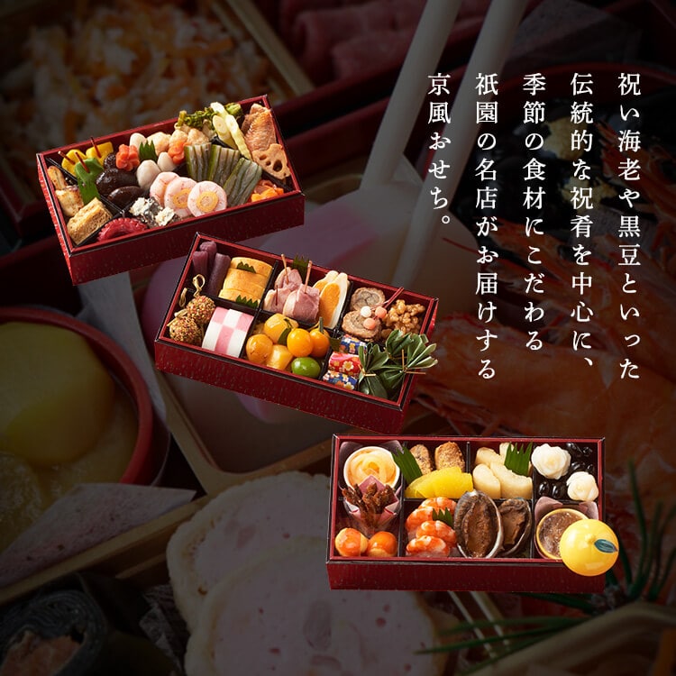 祝い海老や黒豆といった伝統的な祝肴を中心に、季節の食材にこだわる祇園の名店がお届けする京風おせち。
