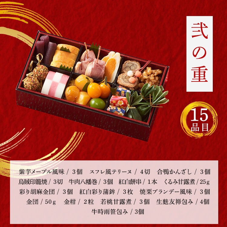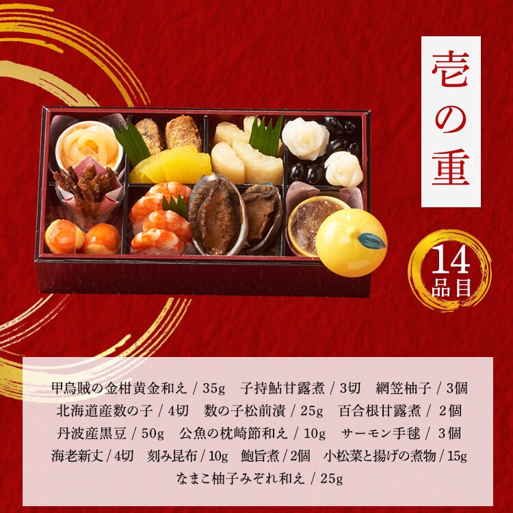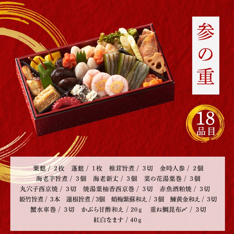 蟹水車巻(国内製造)、スフレ風テリーヌ(液全卵、砂糖、魚肉、液卵白、その他)、紅白彩り蒲鉾、海老新丈(1の重)、椎茸旨煮、丹波産黒豆、金団(生あん、砂糖、オリゴ糖)、海老新丈(3の重)、牛肉八幡巻、菜の花湯葉巻、紅白なます(大根、人参、甘酢)、生麩友禅包み、海老芋旨煮、子持鮎甘露煮、彩り胡麻金団(生あん、砂糖、味付ごま、栗甘露煮、その他)、甲烏賊の金柑黄金和え、北海道産数の子、合鴨かんざし(合鴨ローススモーク、乳等を主要原料とする食品、その他)、紫芋メープル風味、金柑、丸穴子西京焼、重ね鯛昆布〆、サーモン手毬、粟麩、数の子松前漬、なまこ柚子みぞれ和え、くるみ甘露煮、焼湯葉柚香西京巻、焼栗ブランデー風味、赤魚酒粕焼、蛸梅紫蘇和え、烏賊印籠焼、鰊黄金和え、鮑旨煮、かぶら甘酢和え、若桃甘露煮、姫竹旨煮、蓮根旨煮、百合根甘露煮、小松菜と揚げの煮物、牛時雨笹包み、蓬麩、網笠柚子(柚子、砂糖)、公魚の枕崎節和え、刻み昆布、金時人参、紅白餅串/加工でん粉、調味料(アミノ酸等)、ソルビット、糊料(増粘多糖類、加工でん粉、セルロース)、酸味料、pH調整剤、酒精、グリシン、乳化剤、トレハロース、着色料(カロチノイド、紅麹、カラメル、黄4、青1、赤102、ウコン、赤104)、酢酸(Na)、リン酸塩(Na)、酸化防止剤(V.C、V.E、EDTA-Ca・Na、亜硫酸塩、エリソルビン酸Na)、環状オリゴ糖、保存料(ソルビン酸K、しらこ)、フマル酸、酵素、香料、甘味料(カンゾウ、ステビア)、漂白剤(亜硫酸塩)、発色剤(亜硝酸Na)、膨張剤、凝固剤、グリセリンエステル、唐辛子抽出物、ミョウバン、V.B1、重曹、硫酸鉄、くん液、(一部に卵・乳成分・小麦・えび・かに・くるみ・あわび・いか・牛肉・ごま・さけ・さば・大豆・鶏肉・豚肉・もも・やまいも・ゼラチンを含む)