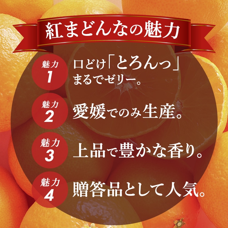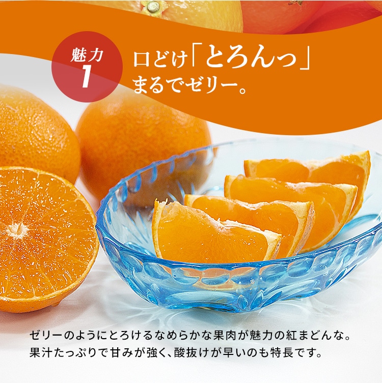 愛媛県でしか生産されない愛媛オリジナルの柑橘「紅まどんな」。その名のとおり、紅色をした麗しい果実で、果肉はとても甘くやわらかく、口の中でゼリーのようにとろけます。