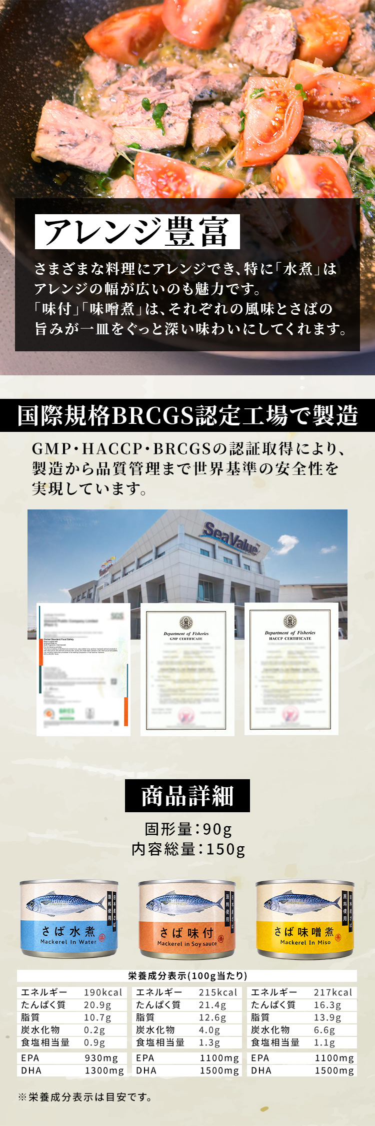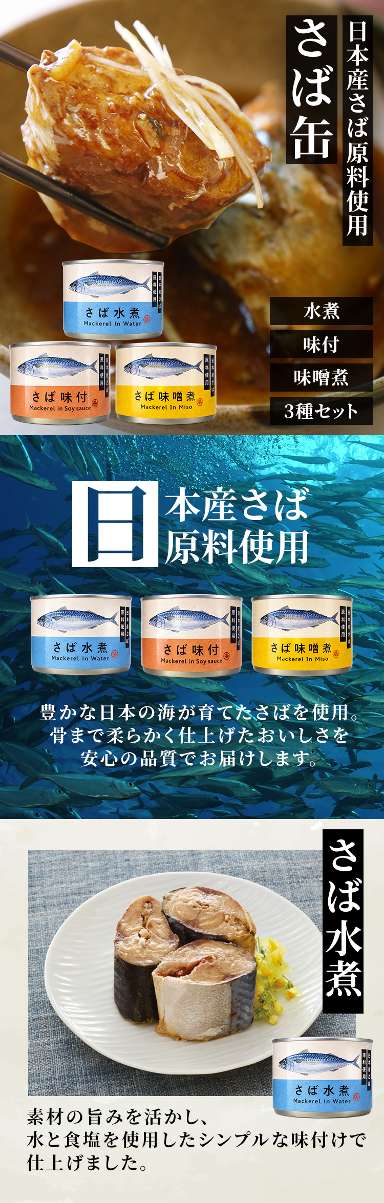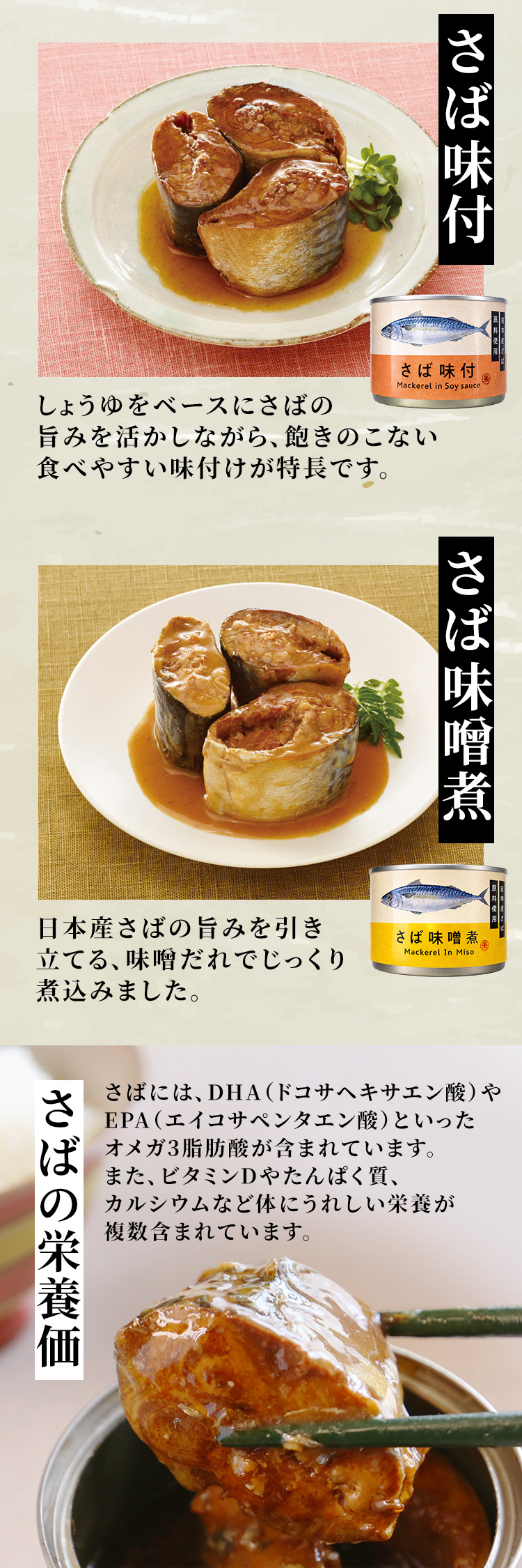 【味噌煮】日本産のサバ原料を使用し、味付けには日系味噌メーカーの味噌を贅沢に採用。