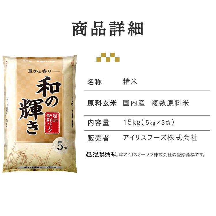 ![[公式][15kg(5㎏ × 3袋)]使用 白米 和の輝き 国産ブレンド 密封新鮮パック 脱酸素剤 低温製法米 アイリスオーヤマ 15kg/白米](/img/0119/goods/4/0119-7342092.jpg)