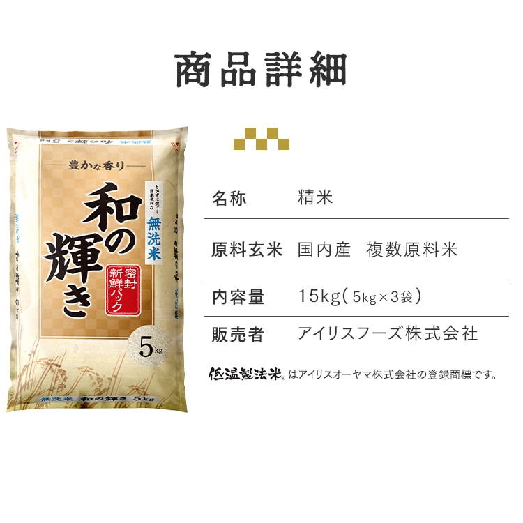 ![[公式][15㎏ (5㎏ × 3袋)][無洗米]使用 白米 和の輝き 国産ブレンド 密封新鮮パック 脱酸素剤 低温製法米 アイリスオーヤマ 15㎏/無洗米](/img/0119/goods/3/0119-7342093.jpg)