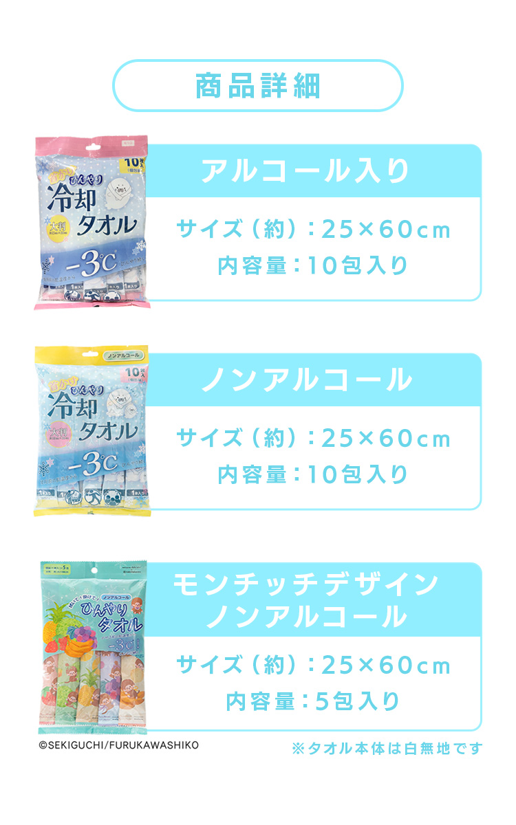 【送料のご案内】 ・購入合計金額が【3,980円(税込)】以上の場合【送料無料】でお届けします! ・購入合計金額が【3,980円(税込)】未満の場合【送料660円(税込)】を頂きます。 ※沖縄県・離島の場合にはご注文時に別途、【離島料金660円(税込)】が加算されます。予めご了承ください。 【アルコールタイプ】 25×60cmの大判サイズ。首に巻いて使える! のせる前の肌温度から-3℃!(※)ひんやり続く! レジャーに スポーツに 野外イベントに 【ノンアルコールタイプ】 25×60cmの大判サイズ。首に巻いて使える! のせる前の肌温度から-3℃!(※)ひんやり続く! レジャーに スポーツに 野外イベントに ノンアルコールなので肌が弱い方、お子様にも使いやすくなっております。 ※使用環境や個人差により効果は異なります。 ※リニューアルに伴い、パッケージ・内容等予告なく変更する場合がございます。予めご了承ください。 ●商品サイズ(cm) 幅約4×奥行約2×高さ約21 ●商品重量 約0.37kg ●規格 成分:水、エタノール、アルキルグリコシド、ポリソルベート -20、安息香酸ナトリウム、エチルヘキシルグリセリン、1,3-プロバンジオール、防雲剤 ユーザーレビューあなたへのおすすめ |