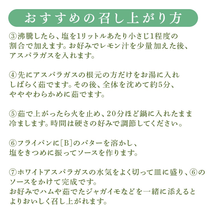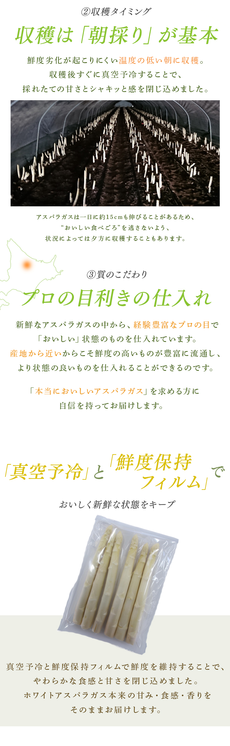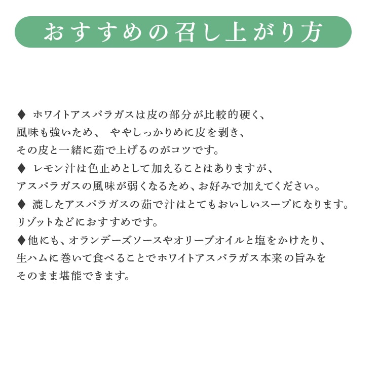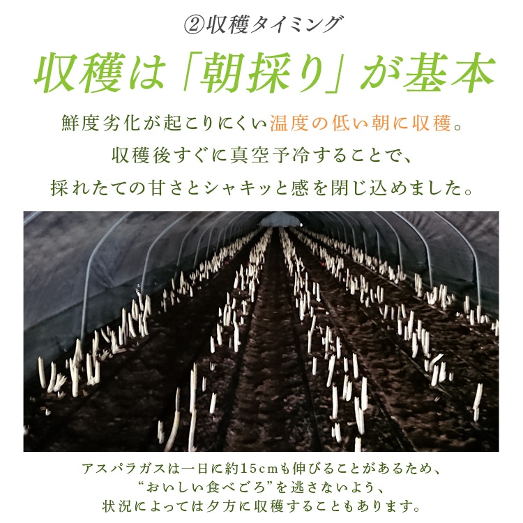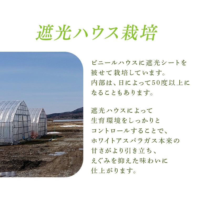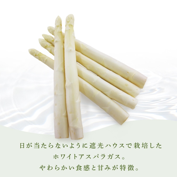 芽の出る前に盛り土をして、土中で生育させたホワイトアスパラガスを鮮度保持袋に入れてお届けします。